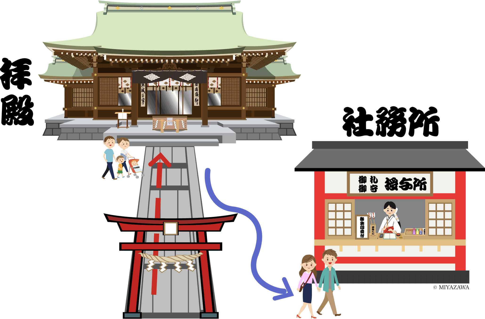 神社の場合は「授与所」または「社務所」でいただけます。絵馬、お守りなどの授与品を販売している場所やその近くにあります。
