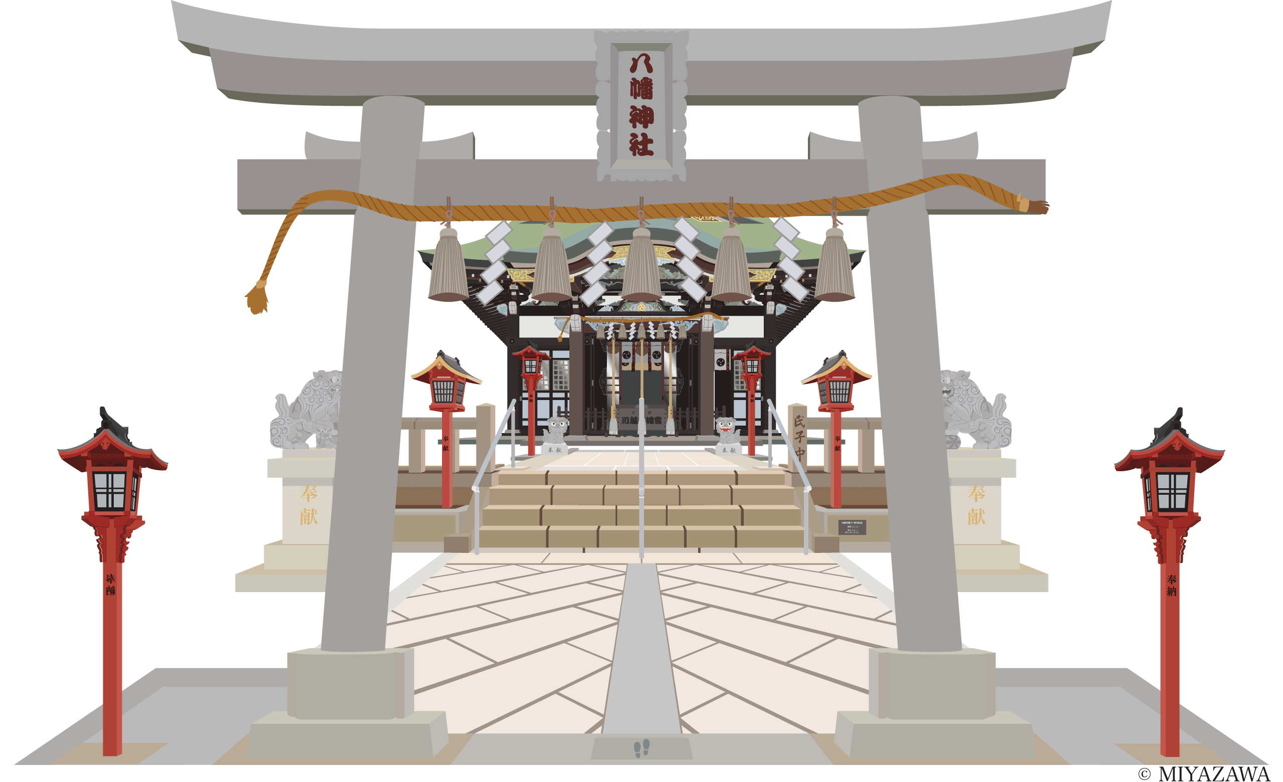 神社を最も象徴するものが、地図記号にも使われている鳥居です。神社の入り口にあたり、神聖な区域である境内と実世界とを分ける境界線として、邪悪なものが侵入するのを防ぎ、そこが聖域であることを示す門としての役割を持つとされます。