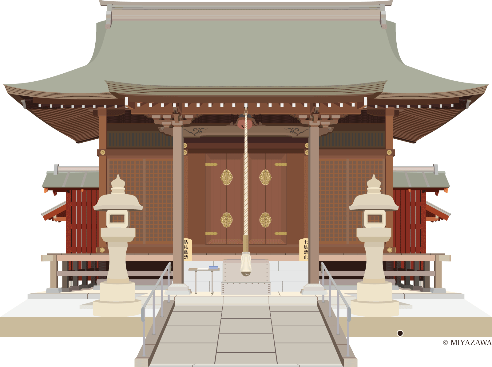 本殿は、三間社流れ造り、銅版葺、朱漆塗り室町末期から江戸初期の朱塗りの華やかな様式をよく残しています。現在は老朽化のために新拝殿が再建されました。神輿形厨子に安置される僧形の木像は、大山咋神を表しています。